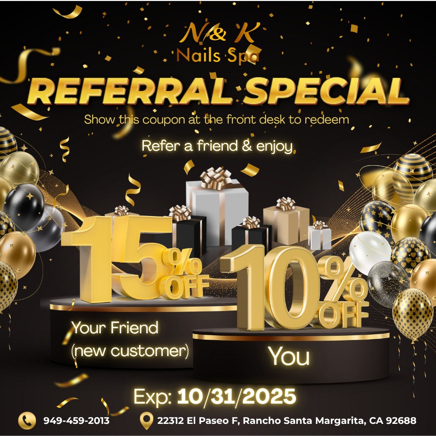 N&K Nails Spa in Rancho Santa Margarita, CA 92688 is your one-stop shop for a rejuvenating nail salon experience. Our goal is to blend top-of-the-line products with expert techniques to provide you with the best nail care services in the area.
